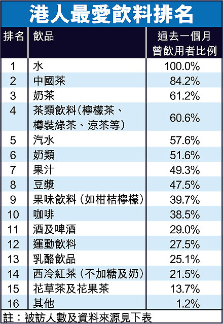立頓(Lipton)最近委託港大社會科學研究中心進行一項港人飲品調查,今年6月23至27日期間成功以電話訪問了335人。調查發現,過去一個月受訪者最常喝飲品除了水(佔100%)外,最愛喝的便是傳統中國茶(84%),其他依次序的是奶茶(61%),檸檬茶、樽裝綠茶等茶類飲料(60.6%)、汽水(57.6%)等(見表)。