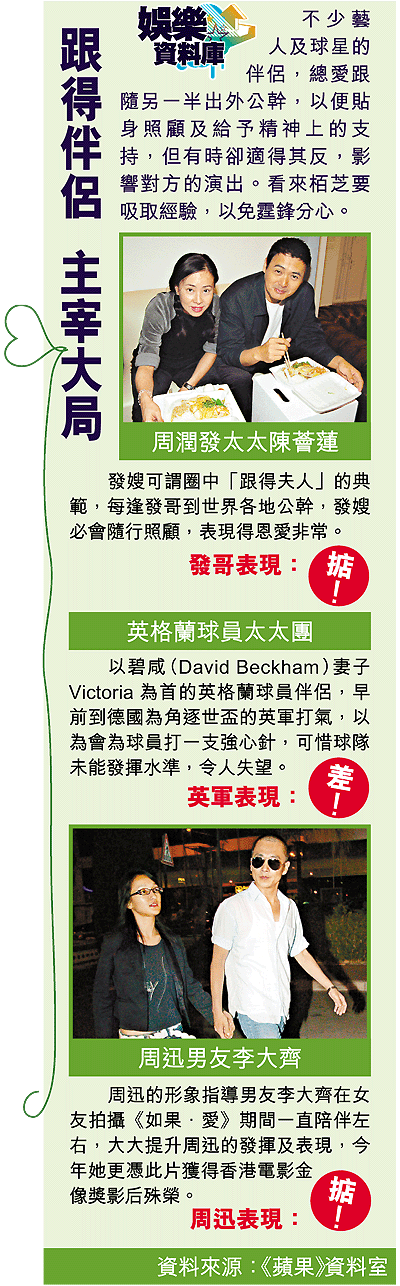另一邊廂的栢芝未有隨愛郎開工,昨午近2時才現身,她先派助手探路,向在酒店等候的記者問道:「你哋有邊幾間喺度呀?佢𠵱家打緊波,影唔影呀?」原來戴墨鏡的栢芝已帶齊音響駐守室內桌球室,邊聽音樂邊與女助手篤波,吸引不少職員及住客上前索簽名。
