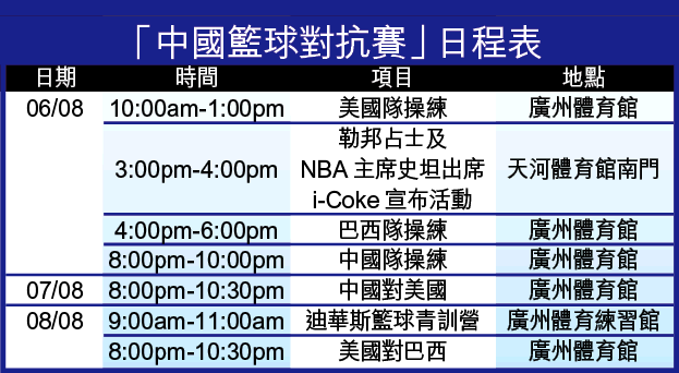 今日上午,夢幻隊將前往明日舉行「中國籃球對抗賽」的場地──廣州體育館進行首課操練。下午,勒邦占士及獲廸等個別球星,將分別出席一些當地的傳宣活動。
