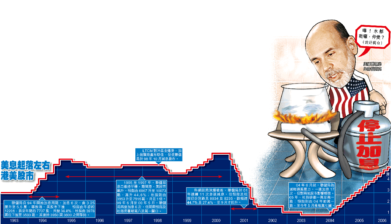 到94年聯儲局一年內加息6次,由3厘加至6厘。港股應聲由年初12201,下挫至年尾的7707點,跌幅達36.8%;而美股則於3950與3600點間爭持。95年開始,美息維持5.75至6厘之間,港股及美股才標升,分別漲約3000千及1300點。