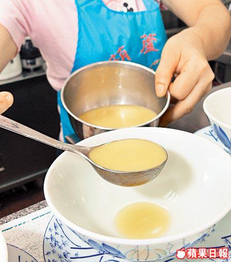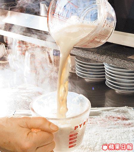 撞奶易學難精,陳太教店長阿姐幾年,阿姐仍偶會失手:「我學咗幾年先撞得好。」原來撞奶不需要出盡九牛二虎之力,「倒都得㗎,最緊要水牛奶同薑汁比例份量適宜。撞奶最緊要滾,一唔滾就撞唔成。」拍照時,攝影師不斷要求:「阿姐,唔該,唔該Hold撞奶嘅動作,係,你係醒,Hold住。」撞奶只需5秒,卻因多番拍照,累得阿姐要不停用微波爐翻熱水牛奶,拍一個動作,共翻熱了十幾次,對溫度要求一絲不苟,現在才知道,一碗美味的薑汁撞奶,不是靠撞彩撞出來的。
