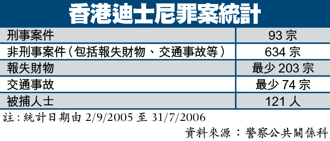 【本報訊】開幕未滿一年的香港廸士尼樂園淪為「犯罪樂園」。根據警方最新數字,廸士尼樂園自去年9月中開幕至今年7月,已錄得727宗報案紀錄,其中過去4個月被捕的犯案人士達72人,更大幅增加46%;所有被捕人士超過一半是來自內地與海外的旅客。警方否認犯案率偏高是因為廸士尼限制警員進入樂園查案,又強調雙方保持緊密聯繫。記者:黃偉駿