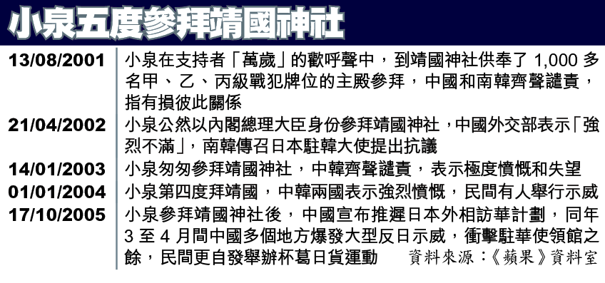 但小泉今天參拜供奉戰犯的靖國,等於向鄰國的歷史傷口撒鹽。中國、南韓等已提出嚴峻警告,小泉那樣做是致力為軍國主義復辟。中國上周四更召回駐日大使王毅,着他在北京逗留兩周。要駐日大使「臨時回國」,是北京給東京的一個「先發抗議」,小泉不理,中日肯定再掀外交風波,令兩國關係更低迷。日本甚麼「借筆外交」、「廁所外交」都難打破兩國僵局。