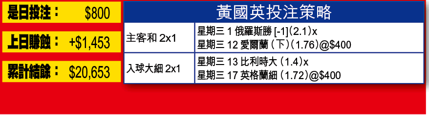 今次平均注碼出擊,俄羅斯作重心配主場受讓的愛爾蘭,其次是比利時對哈薩克開大,與英格蘭悶戰希臘,開細的機會很大;希望今次的選擇能再增盈利,為長期作戰增添更多本錢。