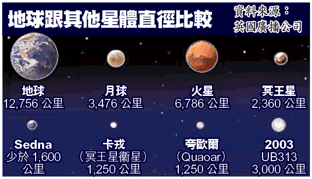 「齊娜」是去年由美國天文學家布朗(MichaelE.Brown)發現,它較冥王星距離太陽還要遠,但直徑有3,000公里,比冥王星還要長640公里。