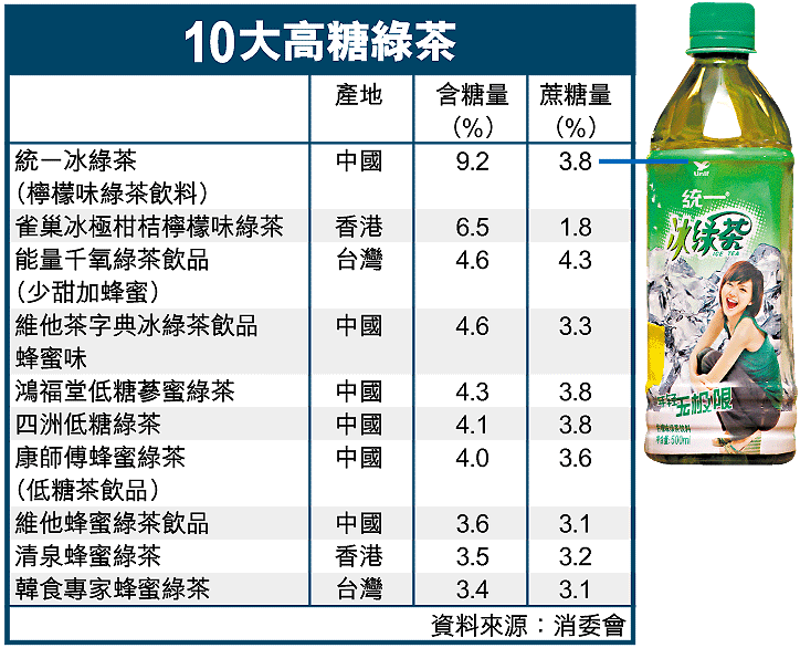 【本報訊】標榜健康天然的樽裝綠茶近年大受港人歡迎,然而綠澈背後原來不一定健康。消費者委員會近日測試市面30款樽裝綠茶,發現有14款的糖含量介乎0.4%至9.2%不等,其中一款內地樽裝「統一冰綠茶」500毫升裝約含46克糖,以每克糖提供4,000卡熱量推算,一樽便有184,000卡熱量,比一罐355毫升可樂的熱量(平均約146,000卡)還要高。有營養師警告,不知就裏的糖尿病患者若長期飲用,將大大增加患「糖尿眼」與腎功能衰退的風險。