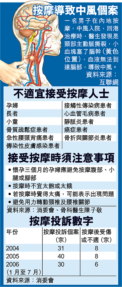 事實上,近年港人愈來愈愛北上按摩,今年農曆新年,一名30多歲港商到內地按摩,疑因按摩師手法不當,出現頭痛、暈眩及嘔吐症狀,返港後中風入院。經醫生檢查後發現其頸靜脈撕裂,被血塊阻塞部份血管而中風,需長期治療。