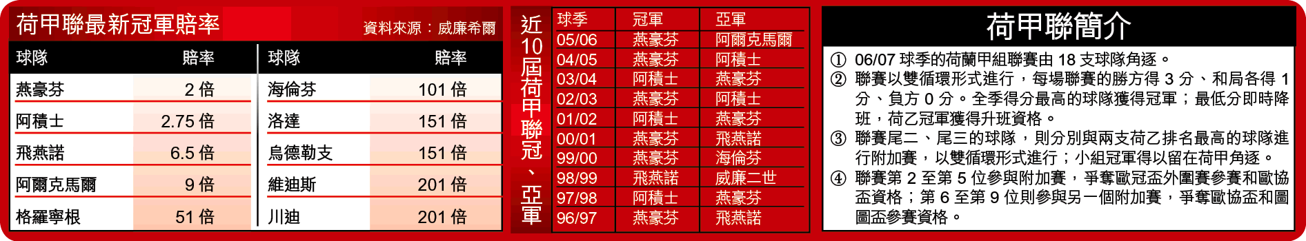 外國賭博公司將燕豪芬列為2倍奪標大熱不無道理,但阿積士的2.75倍才是筆者心水之選。值得一提的是,荷甲賽例有別於一般歐陸聯賽,「季後賽」尤其多;故此接近季尾時若然名次大定,捧場客便需小心某些球隊忽然「放軟手腳」,跣你一鑊。季尾比賽常常暗藏「玄機」,「真與假」只在一線之差。
