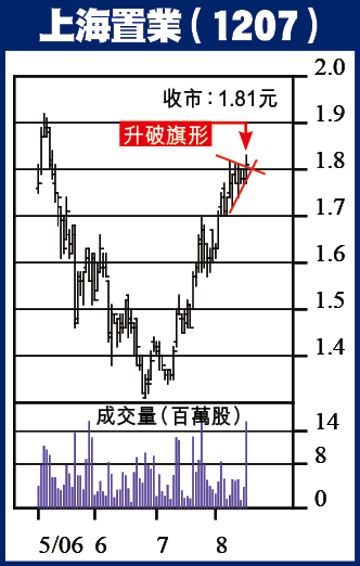 上海置業(1207)個勢亦好強,收1.81元,升3仙,成交1500多萬股,全日最大沽家係滙豐證券。由5月開始,上海置業走勢形成一個大圓底,噚日成交大增3.2倍,已有突破之勢,照度上去,短期量度上升目標係2.20元。