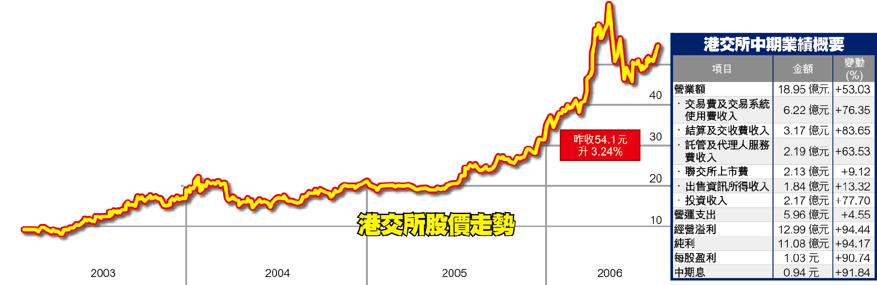 【本報訊】港交所昨上午股價已炒高2.3%,中午公布業績後進一步推高至54.8元,收報54.1元,升3.24%。中期息0.94元,增加91.84%,無論從收入、稅項、純利、成本收入比率(31%)以至股本回報率(23%),皆創歷來半年業績紀錄,至於下半年能否維持?行政總裁周文耀笑言,自己沒有水晶球,無法預測下半年港股成交。