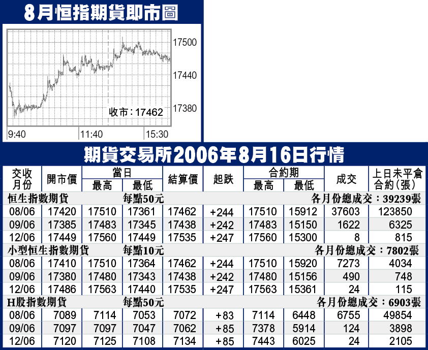 期指裂口高開202點,一度急升至17510,創近6年以來的高位,以17462收市,急升244點,高水11點,成交合約增至3.7萬張。