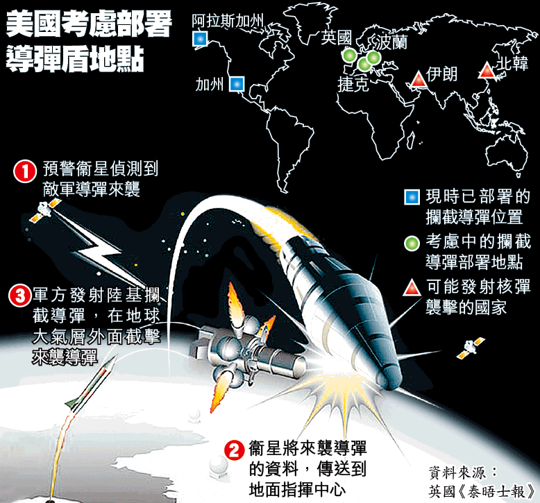 美國首選部署選址原本是波蘭,其次是捷克,但兩國國內反對聲音不小,美被迫再次向最親密盟友英國打主意。《泰晤士報》指美國近期向英國官員「秘密查詢」,問政府會否接受部署導彈盾。批評者指英國如答應就只會吸引美國的敵人施襲。