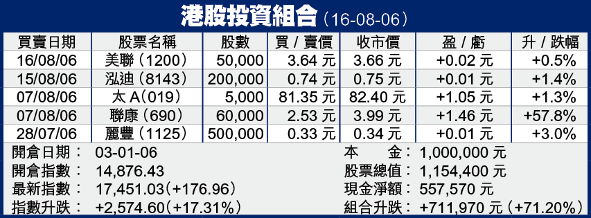 大市昨日升勢由重磅藍籌掛帥,倉內股票得益唔算太多,泓廸(8143)升1仙,收0.75元,太A(019)升0.40元,收82.40元,麗豐(1125)升0.005元,收0.34元,聯康(690)跌2仙,收3.99元,以上各股部署暫時冇變。