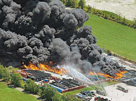 加拿大蒙特利爾市(Montreal)北部工業區一間塗料廠前天發生火警(圖一),有毒化學物質燃燒時產生大量毒煙,消防員緊急疏散1,500名員工及附近居民,事件中有三人受傷。同日,安大略省(Ontario)阿默斯特堡(Amherstburg)一間回收廠發生大火,濃煙烈燄沖天,消防員忙於灌救(圖二)。美聯社