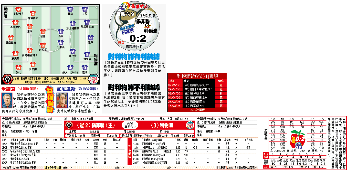 兩軍對上一次聯賽碰頭,已是12多年前的陳年往事,故不必銘記於心;也許,紅軍上季曾令不少捧場客「贏波輸錢」,但過去已成歷史,今屆球隊已煥然一新,狀態佔優,加上質高富經驗的情況下,要一勝超聯新仔錫菲聯確實不難。「讓球主客和」紅軍讓一球,有2.5倍好分,一於熱捧「客勝」;想多賺一注,建議吼「細」好路!