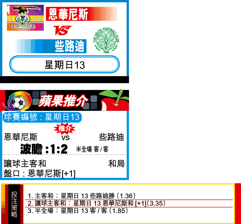 賭蘇超些路廸主客和,就好似英超車路士,一季有分頭的單W唔多過4次,想要博分頭,就要向「讓球主客和」埋手。周日些路廸作客恩華尼斯,中場線陣容不整,一於博「讓球主客和」的「和局」。(球賽編號:星期日13;香港時間今日9:00pm開賽)