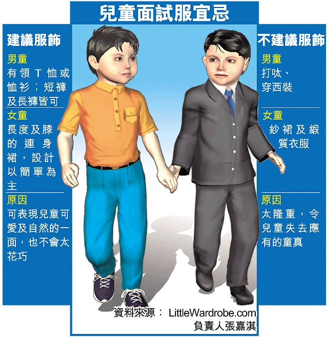 【本報訊】又到知名小學及幼稚園招生的時候,子女能否入讀心儀學校,面試表現是關鍵所在,但「造型」也不能忽視。專家指,家長為子女準備入學面試服飾時,往往「有咁隆重得咁隆重」,男的「打晒呔」,女的穿紗裙,但這反令兒童有失童真,影響學校對子女的第一印象。有名校校長教路:兒童面試時打扮最緊要清潔、整齊,最好展現可愛及醒目的一面。 記者:盧文烈
