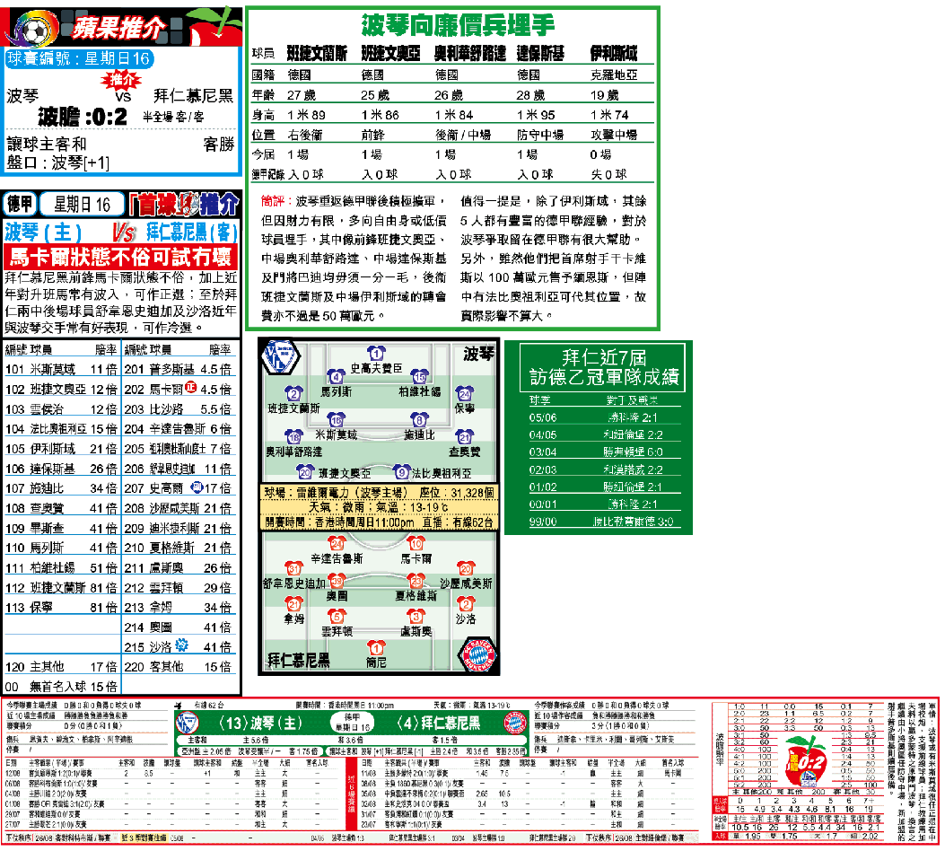 「主客和」拜仁W有1.5倍,可重槌出擊。此外,基於波琴攻力弱,預計難以攻破拜仁大門,波膽可敲拜仁贏2:0或3:0。