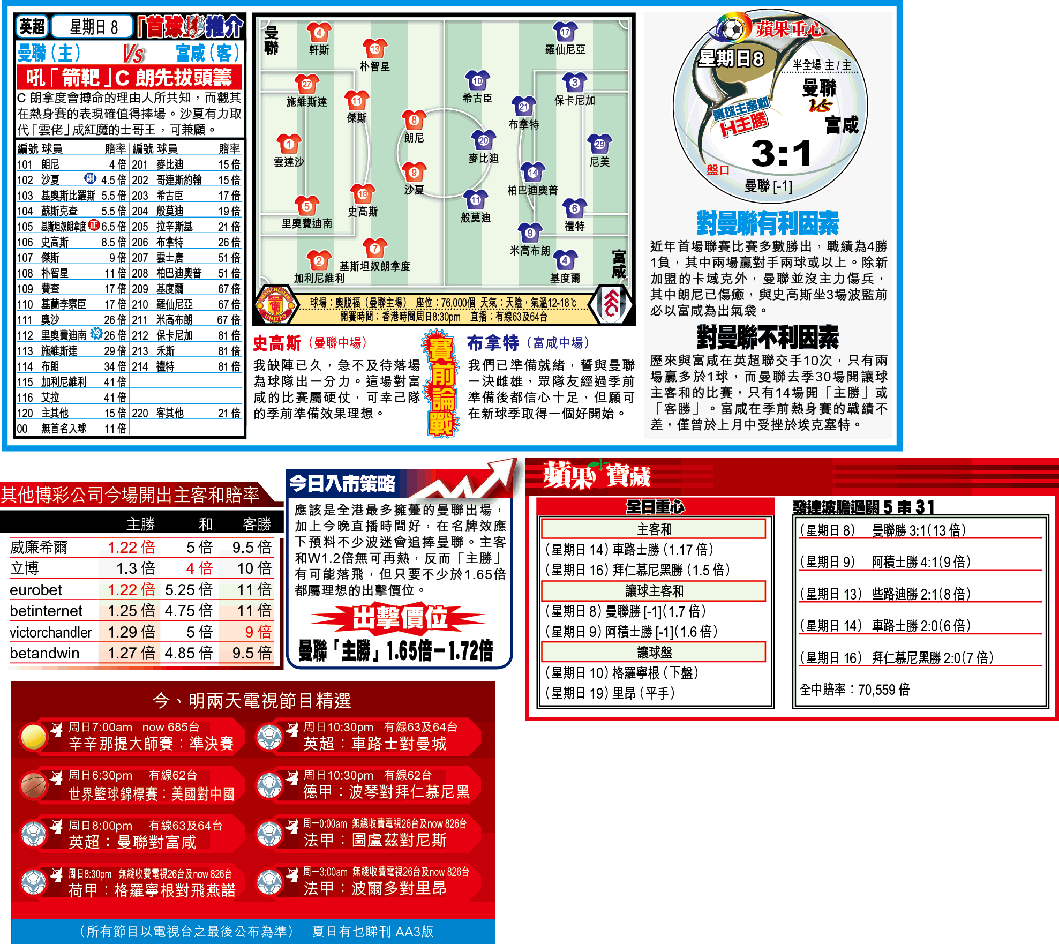 再者,富咸季前除與皇家馬德里拍跳外,其餘對手多非強隊,故期間「戰績佳」或屬假象。以該隊近年不擅作客的風格(如去季作客19場輸14場,失37球,是作客最差一隊),首戰即遇紅魔難逃大敗。今仗波膽首選曼聯贏3:1(13倍),次選4:1(15倍)。