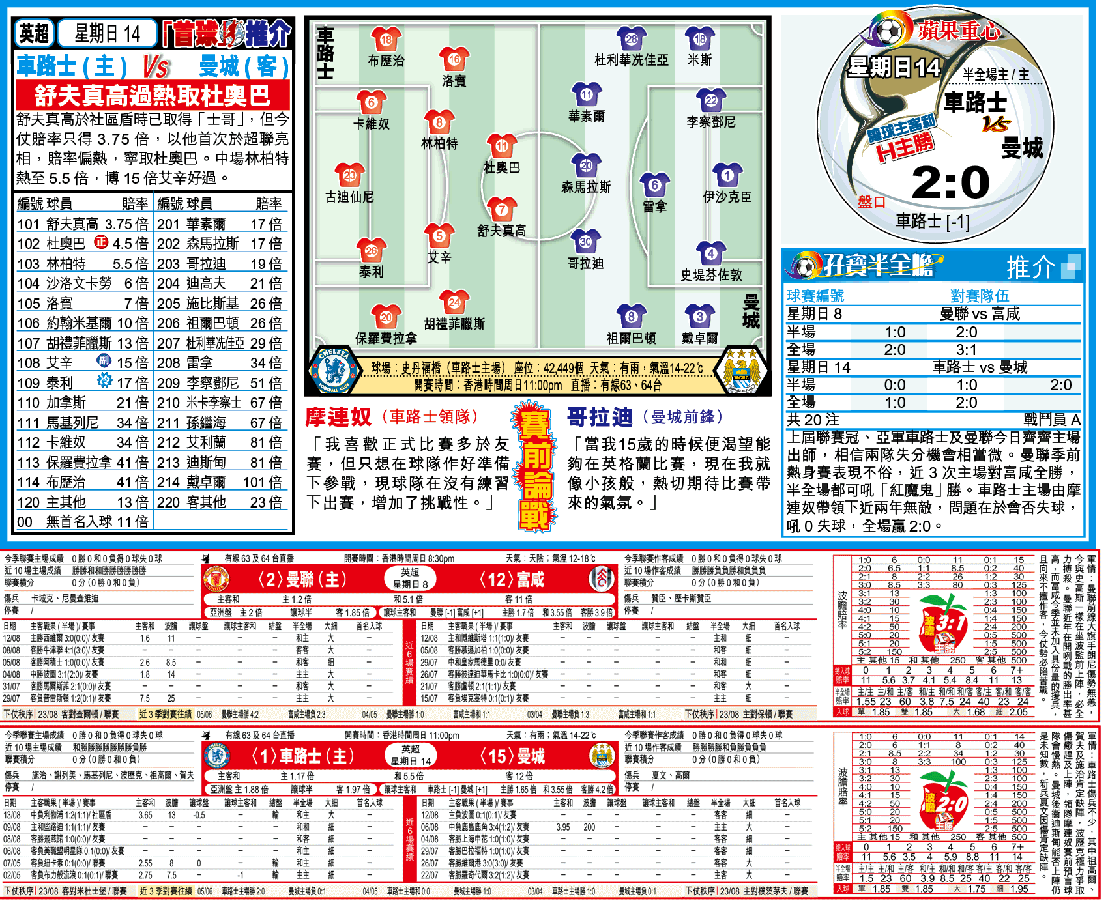 曼城兩季前曾於主場擊敗過車路士,但他們上季再遇「車仔」則無法再爆冷,作客負0:2,主場亦以0:1落敗,兩仗無法在「車仔」身上取得入球。若以季前熱身賽的排陣,領隊皮亞斯有意讓哥拉廸、森馬拉斯及華素爾3名前鋒同時上陣,將華素爾移至較邊位置;惟今仗面對防守能力一向穩健的車路士,縱使對手改由古廸仙尼把關,曼城要爭取入球仍是不易。