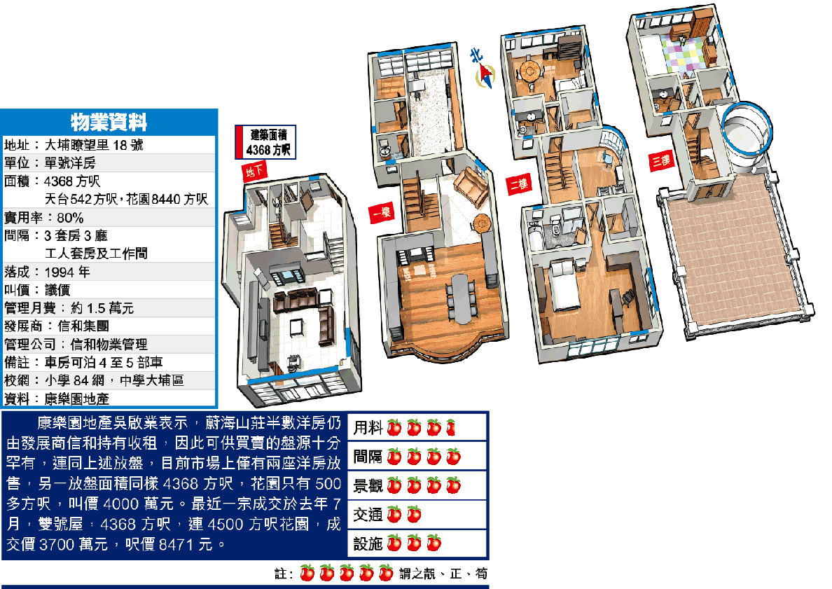 介紹洋房坐落在單邊,坐擁全屋苑面積最大的私家花園,佔地8440方呎,面積之大,區內數一數二。花園大致分3部份,包括與客廳相接的大型魚池和平台部份,地下鋪易於打理的防滑磚,旁邊的魚池水深7米,飼養了數十條錦鯉。下行數級樓梯,是一片廣闊的草原,建有涼亭,是休憩的好地方。再往下行是果園,除較普遍的龍眼及香蕉樹外,還有少見的大樹菠蘿和芒果樹,空氣中瀰漫着甜密的果香,輕鬆在花園消磨大半天,可是人生享受。