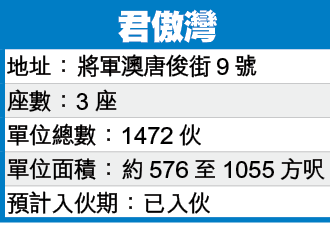 由新世界發展、地鐵及周大福合作發展、位於將軍澳的君傲灣,是區內近年大型新盤之一。屋苑租盤成交活躍,單是7月份,將軍澳區錄得的312宗租賃成交,君傲灣已佔三成,較維景灣畔及將軍澳中心還要多;而將軍澳區7月份的租賃成交個案,較6月份急增逾四成,創下區內新高,可見屋苑出租情況理想。對於有意買樓收租人士而言,投資潛力十分吸引。