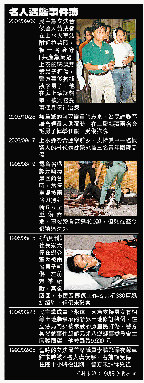 【本報訊】民主黨副主席何俊仁受襲重傷,究竟誰是行兇者?民主黨內部估計,事件應不涉桃色、金錢、政治及保釣等問題,相信與何本人的律師事務所業務有關,因為其律師樓一向有接「其他人唔敢接嘅官司」。民主黨主席李永達引述何俊仁說,事件相信不涉及私人恩怨,可能與立法會的公務或律師樓的事務有關。 記者:莊曉陽 林社炳