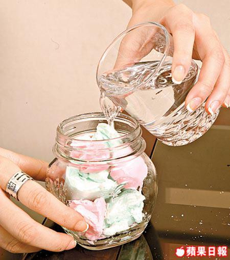利用一空瓶集合碎番梘,加入少量溫水溶解它們,之後可用牙刷清洗任何污迹。
