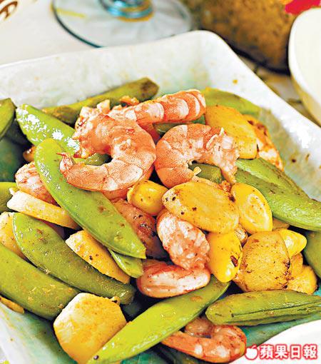 做法:甜豆汆水,盛起瀝亁。蝦仁加調味醃20分鐘,滾水灼至轉橙色,撈起備用。燒熱油鑊爆香拍爛的蒜頭,然後加入切半馬蹄、白果及甜豆炒勻。最後放蝦仁、灒上湯,埋生粉芡即成。