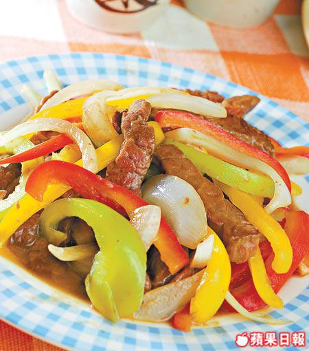 材料:牛柳4両、青紅黃燈籠椒各1/4個、洋葱1/4個、清雞湯50毫升