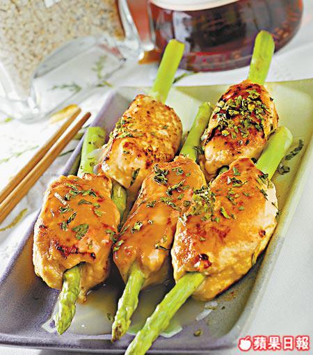 材料:BB蘆笋6條、免治雞胸肉200克、雞湯100毫升