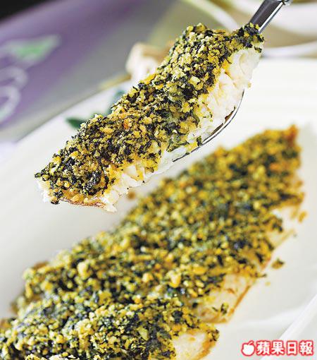 做法:龍脷柳加醃料醃15分鐘。菠菜葉以滾水烚至軟身,瀝亁水剁成碎,再與調味料拌勻,塗滿龍脷柳面。放入預熱焗爐,200度焗10分鐘,再轉160度焗10分鐘至魚身金黃即可。