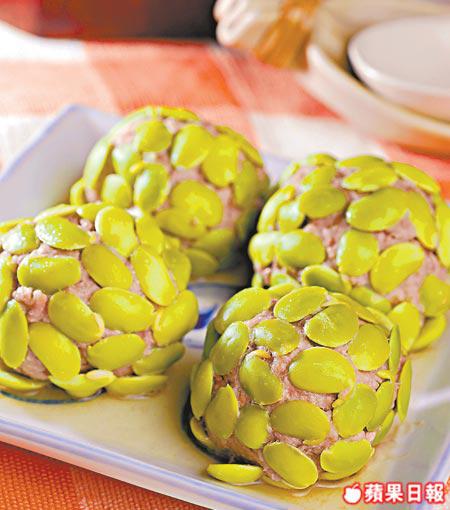 做法:豆腐切去硬邊,與豬肉及馬蹄粒加調味料拌勻,並撻至起膠。毛豆仁以熱水浸泡,去豆衣後開半瀝亁水。將豬肉平均分為8份並搓成圓球狀,沾上毛豆仁,放鑊中以猛火蒸10分鐘即成。