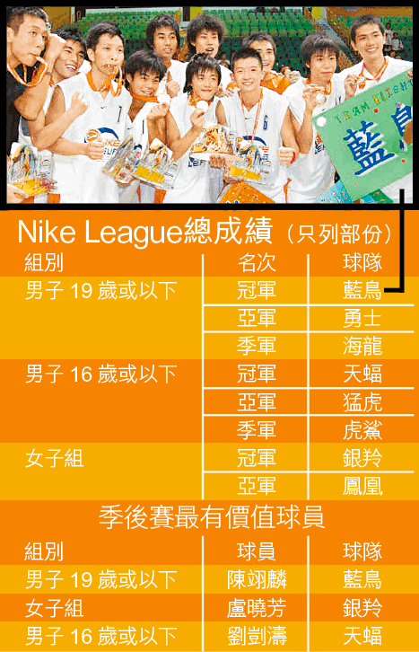 【本報訊】近年來風靡本地學界籃球壇的羅意庭,昨晚在NikeLeague全港青少年超級籃球聯賽次回合,雖然個人獨取全場最高31分,而其效力的勇士隊亦以85:82贏得次回合比賽,但兩回合總計終仍以3分不敵藍鳥,屈居亞軍。銀羚則奪女子總冠軍(見附表)。
