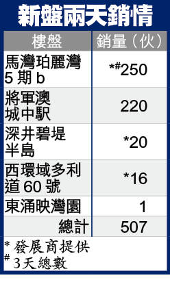 【本報訊】市場焦點繼續落在新地(016)馬灣珀麗灣5期b,及長實(001)將軍澳城中駅兩個新盤。新地代理執行董事雷霆說,珀麗灣5期b過去3日售出250伙(見表),套現8億元;因反應理想,考慮加推50至100伙,並加價3至5%。業內估計該盤過去兩天售出156伙,連同其他一手盤,周末兩天共沽出約413伙。