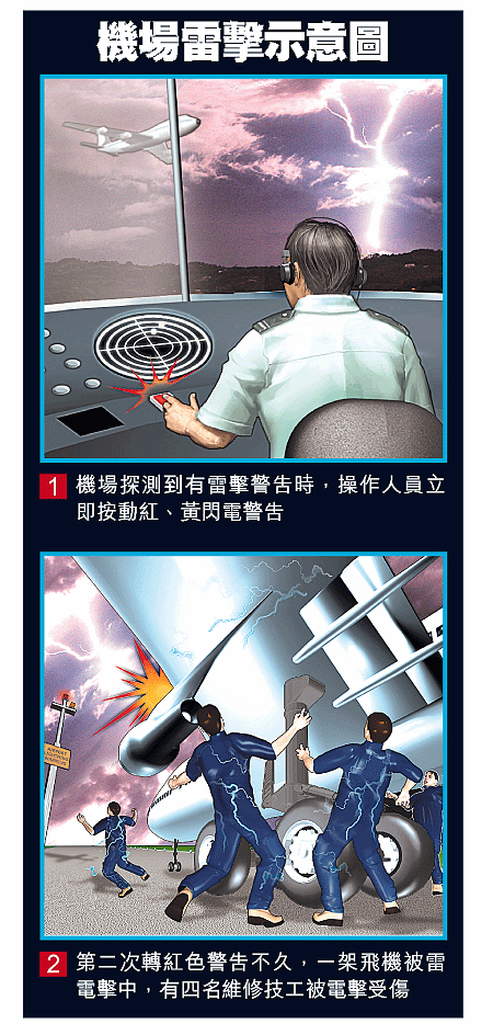 事發昨午近2時,據目擊工人指出,當紅色閃電警告解除並轉掛黃色時,工人如常在戶外進行飛機維修工作,當時機場天色昏暗及下雨,天空不時有閃電及響雷。在飛機庫外,約有十多名技工檢查一架飛機的機翼及機底,當發現警報器發出響聲,並亮起紅色燈號時,他們知道發出紅色閃電警告,按指引需返回戶內地方。