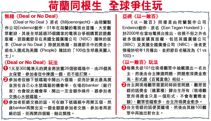 據悉《DealorNoDeal》跟《1Tegen100》原來同屬荷蘭Endemol公司,原本亞視也有洽購《DealorNoDeal》香港版權,但最後敗於無綫之下。該節目近年在美國、英國、法國及德國等30多個國家熱播,遊戲玩法跟當年無綫的《花王俱樂部》和《15/16》近似,參加者只需回答一條簡單問題,然後從26個美女手持的號碼箱中挑選一個號碼,號碼箱內分別放有一元至300萬港幣不同金額,參加者揀完心水號碼後,即場揭曉若干個餘下的號碼箱,然後由在場銀行家計算參加者中大獎的機會率,再開出一定金額跟參加者交換。
