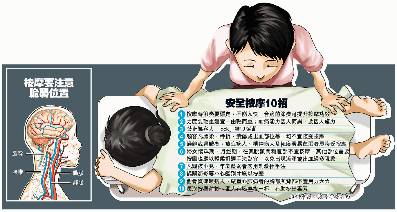 【本報訊】消費者委員會踢爆有按摩員用不正確手勢弄傷顧客,喚起各界對按摩服務質素的關注。僱員再培訓局近年致力培訓按摩員,每名學員都會獲傳授安全按摩「秘笈」,嚴禁他們為顧客鎖頸(俗稱lock頸)及踩背,同時避免癌症患者及極度虛弱人士等接受按摩;過去多年已有逾3,000名學員完成培訓課程。該局正積極開拓按摩市場,日後市民行商場、逛展覽會,也有機會一嘗按摩服務。 記者:盧文烈