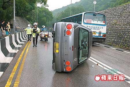 【本報訊】昨午1時許,天下着毛毛細雨,一輛俗稱「戰神」Skyline跑車沿西貢清水灣道落斜,駛經打鼓嶺新村對開處時,24歲姓戴司機報稱閃避切線車輛扭軚閃避,加上地面濕滑,疑失控高速猛撞左邊石壆,由於衝力強大,跑車反彈路中向右翻側。事件中跑車上男司機及兩女一男乘客並無受傷,僅其中一人手臂擦傷,由救護員敷治後並無大礙,毋須送院。