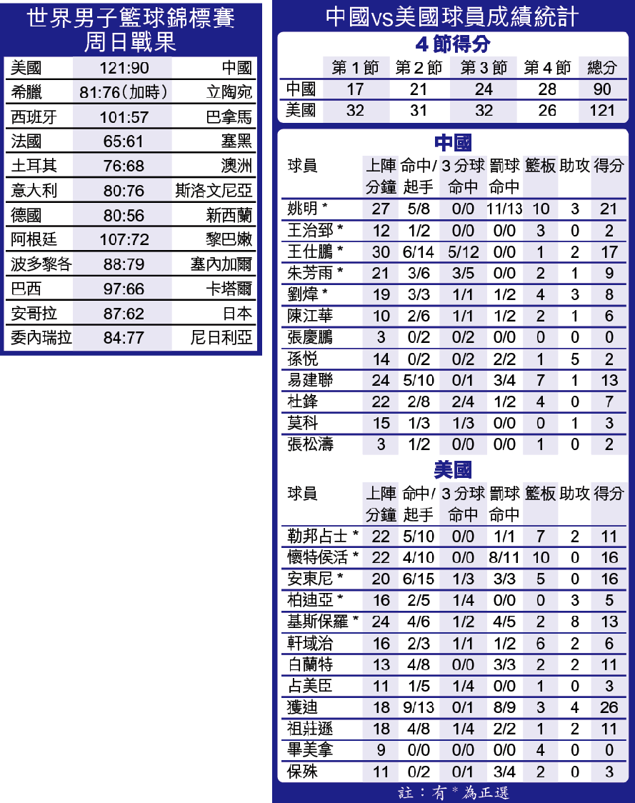 中國男籃周日在日本舉行的世界籃球錦標賽D組第2場分組賽,慘遭勁旅美國夢幻7隊蹂躪,在姚明5犯離場下,以90:121大比數落敗,開賽以來兩戰皆北;王治郅表現差劣,被教練批評。