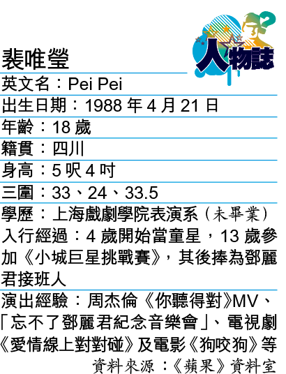 有小鄧麗君之稱的裴唯瑩(裴裴)已不再是當年參加歌唱比賽的13歲小妹妹,長得亭亭玉立的她絕對是18歲卜卜脆,還簽了林建岳旗下的紅館經理人公司,並獲點名力捧,早前她便到日本接受歌唱及舞蹈訓練,目前則在上海修讀演藝課程,4年後才正式畢業,但為展開香港的演藝工作,平均一個月就會飛來港一次。