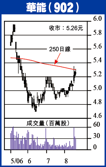 華能國際(902)上日報收5.26元,升0.7%,股價於5月由5.70元水平開展跌浪,在4.70元見底回升,但一直受制於250日線,至上周三,股價成功挾大成交破關而上,並同時升越保歷加通道頂,日內若突破5.40元,將反覆推向5.80至6元區域,現價買入,以5元作止蝕位,上破5.40元可加1注。