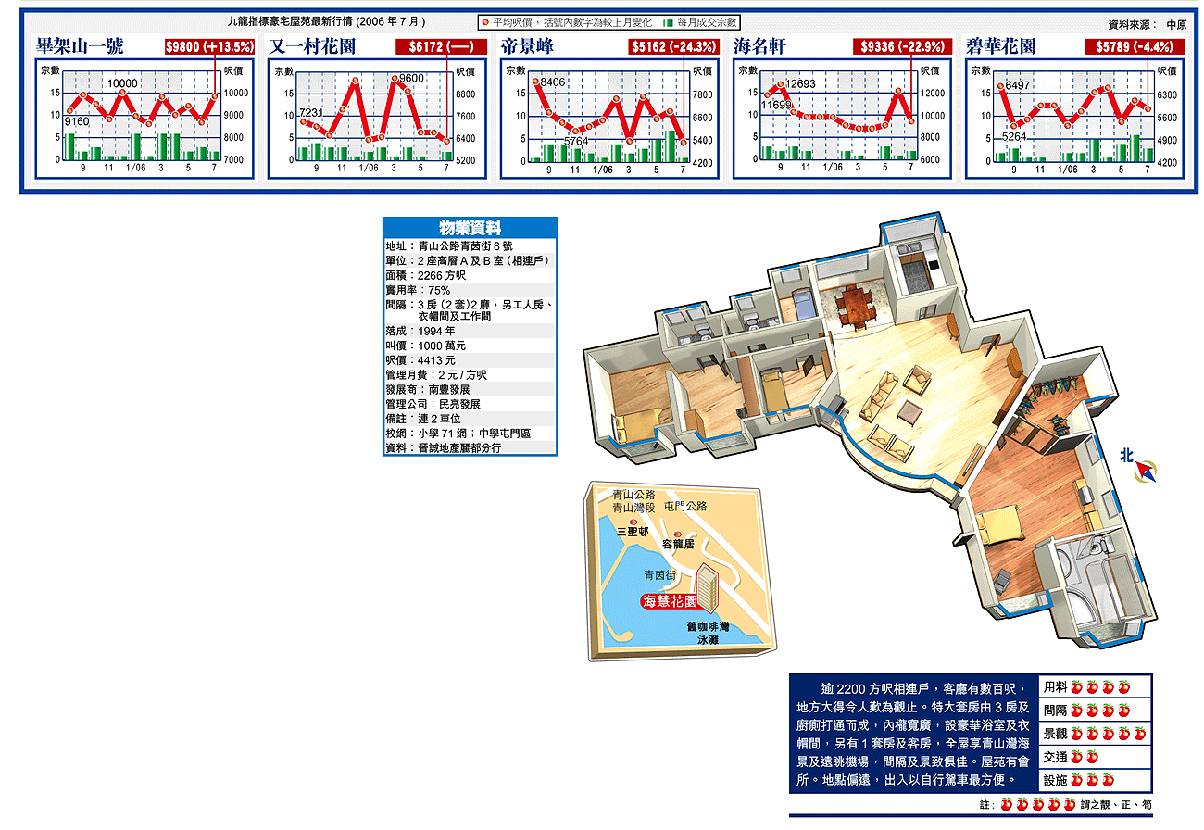 晉誠地產張秋說,海慧花園單位分968及1298方呎兩類,放盤有12個,呎價2500至3000元;這單位是唯一自製相連放盤,且附豪裝,故叫價高於市場。最近成交為1座中層A室,1298方呎,7月底以300萬元易手,每方呎2311元。