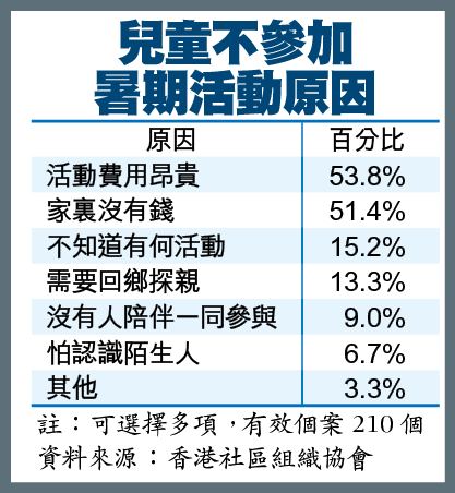香港社區組織協會今年暑假成功訪問216名年齡介乎3至18歲、來自綜援或低收入家庭的兒童,結果發現68%受訪兒童今年並無參加暑期活動,主要原因是活動費用昂貴及家中沒有錢,分別各佔逾五成(見表)。受訪兒童平均只預算60元用作暑期活動的費用,當中近七成受訪者並無錢繳付暑期活動。受訪兒童一般最想參加游泳、樂器、水上活動及球類。