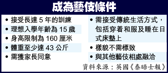 要成為藝伎,要花五年時間學舞、練琴藝、習社交技巧,未必人人捱得過。由初期的以口相傳變成現在的網上招生,有藝伎社表示反應好了。Ichi藝伎社網頁上,就有化濃妝的舞伎照片和一名18歲藝伎的網誌。