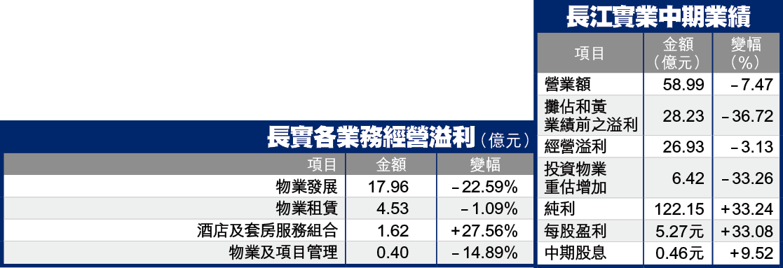 長實解釋,實質盈利倒退是由於入賬的賣樓收益,以及來自投資物業重估升值的賬面利潤減少。長實上半年確認的賣樓收益17.96億元,減少逾兩成,主要來自宇晴軒及新加坡景頤峰,另外都會駅一期、四季豪園及內地珊瑚灣畔二期住宅單位亦於期內完成,部份已售出單位亦包括在中期賬目內。長實解釋,受到上半年落成發展物業減少影響,加上期內利率仍未明朗,拖累本港物業成交量減少,但賣樓邊際利潤維持30%以上。