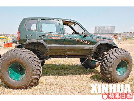 仲有一部無敵四驅車,四個車輪直徑約有30吋,比我們的貨車和巴士還要大,留意一下,這部四驅車只是改了懸掛和下搖臂,沒有增強車架的「剛度」,所以得個樣,一旦在崎嶇山路快跑,分分鐘會斷開兩截。最後精選是香港人好熟悉的日產飛雞,俄羅斯人沒有大改馬力,相反畫到車身五顏六色,只要有噱頭就夠了。