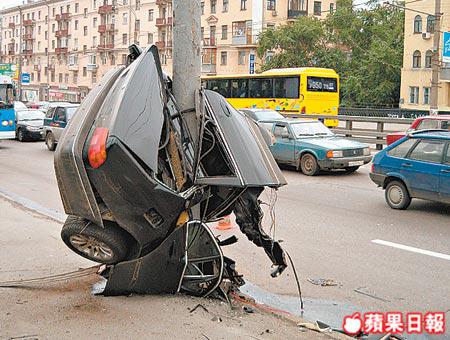 嗱,講開改裝車,東歐地區一樣有香港人所謂的積木車,好像莫斯科這部寶馬3系,在交通意外中撞上電燈柱,整部車好像爛泥那樣黏在電燈柱上,車身就斷開兩截,看來東歐改裝車的水準,和香港土炮差不多。