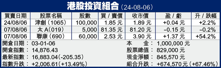 昨日早市在1.85元買入天津創業環保(1065)10萬股,隻股表現亦冇令人失望,逆市升3.9%,收1.89元。如果大家近日有留意內地新聞,都知道內地將在年底徵收污水處理費,並計劃大量興建污水處理廠,希望將所有污水經處理後才排放入江河,改善環境的污染。這個消息當然對津創有利,而從基本因素看,津創現價往績PE14.9倍,預測10.5倍,中長線上升空間不俗,短炒亦較為安心。