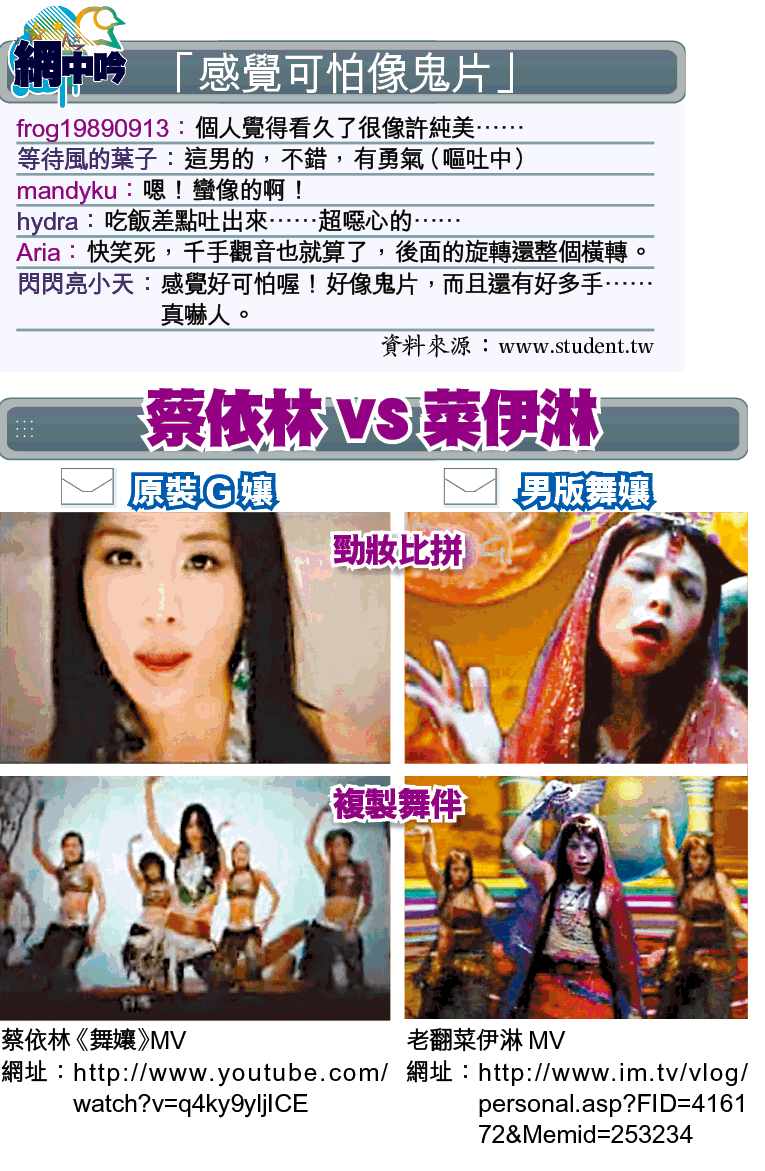 台灣性感小天后蔡依林(Jolin)的驕人G奶和誘人舞姿享譽中、港、台三地,想不到近期台灣竟出現一位驚嚇指數爆燈的男版「菜伊淋」莊子勳,男扮女裝模仿Jolin《舞孃》MV內的火辣舞姿自拍網上短片,大跳令人笑爆嘴的千手觀音肚皮舞,吸引台灣逾66萬瀏覽人次點擊捧場。